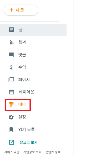 블로그 스팟 관리자 모드로 접속한 후 '테마' 탭을 클릭해주세요.