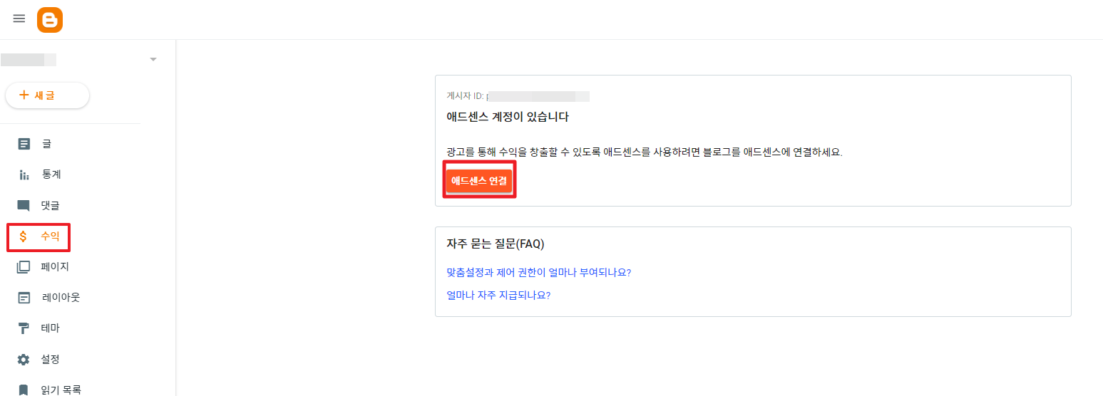 이제 완료가 되었습니다. 구글 블로그 "수익" 탭에 들어가 "애드센스 연결"을 해주면 끝입니다.