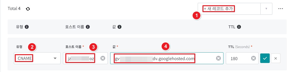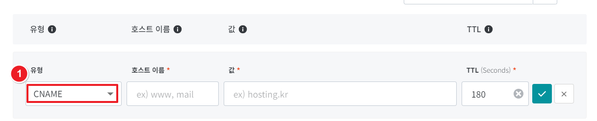다시 호스팅 케이알에 들어간 뒤 유형을 "CNAME"으로 지정합니다.