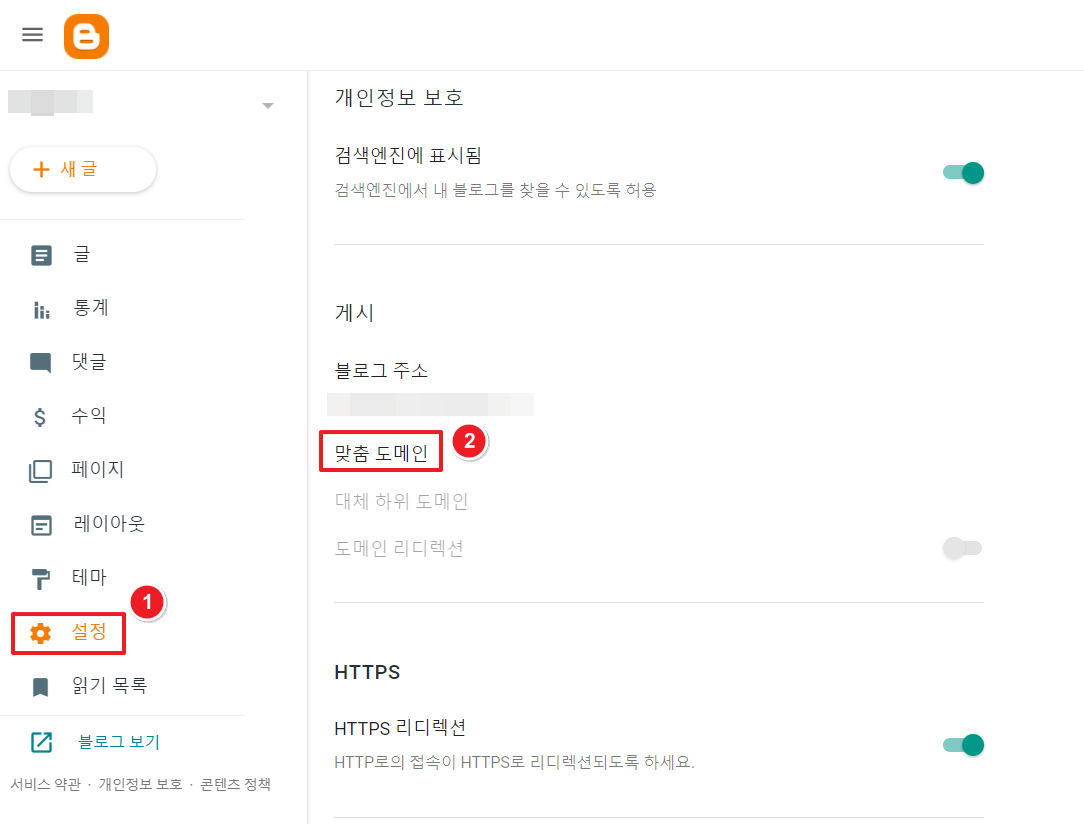 "설정" => "맞춤 도메인"에 들어가세요.