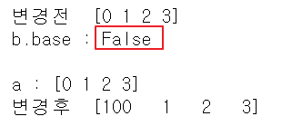 앞서 배운것처럼 copy개념인 flatten b.base is a가 False 가 나옵니다.