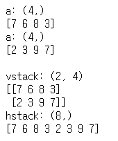 여기서 vstack은 vertical stack 즉 수직방향으로 쌓는다는 의미이고, hstack은 horizontal stack 즉 수평방향으로 쌓는 다는 의미입니다.