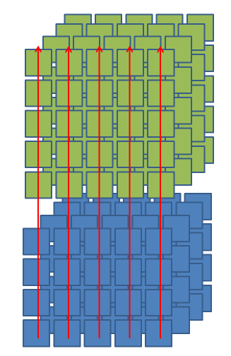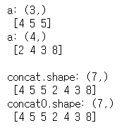 concat0 = np.concatenate([a, b], axis = 1) # row방향으로 했을때는 그림을 보면 파란색이 초록색 에 비해 차원갯수가 하나가 적어서 row #방향으로 했을때 연산이 실패한다.