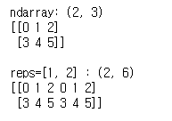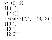 이중 a는 우리가 복사할 값, repeats는 몇번을 반복할것인지, 마지막으로 axis 는 복사를 할때 어떤 방향으로 할지를 의미합니다.