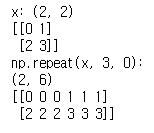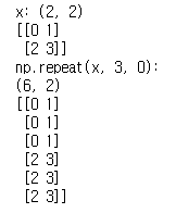 rep = np.repeat(x, repeats=3, axis=0) # 2차원에서는 axis = 0 은 row 방향