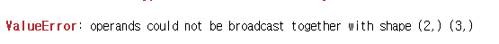 예상대로 output도 아래와 같이 "ValueError: operands could not be broadcast together with shape"를 발생합니다.