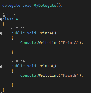 델리게이트에 PrintA, PrintB를 함께 담아보겠습니다.