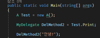 델리게이트가 마치 변수처럼 사용되는걸 알 수 있습니다.