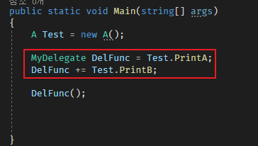 위와 같이 기존처럼 델리게이트를 이용하되, 추가하고싶은 메소드(여기선 Test.PrintB)는 += 를 이용해서 추가 합니다.