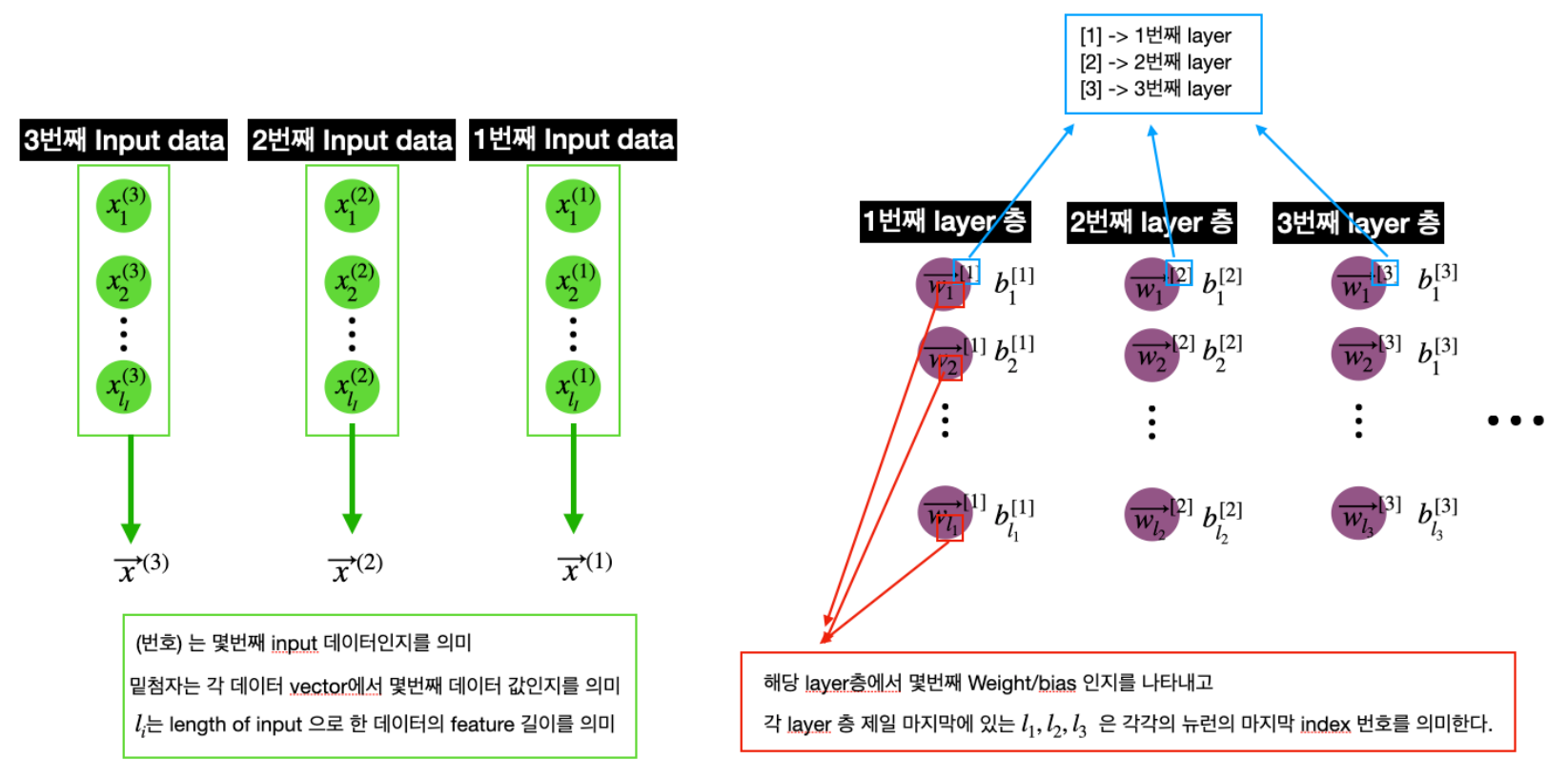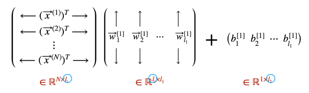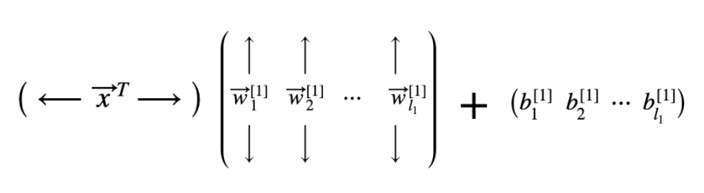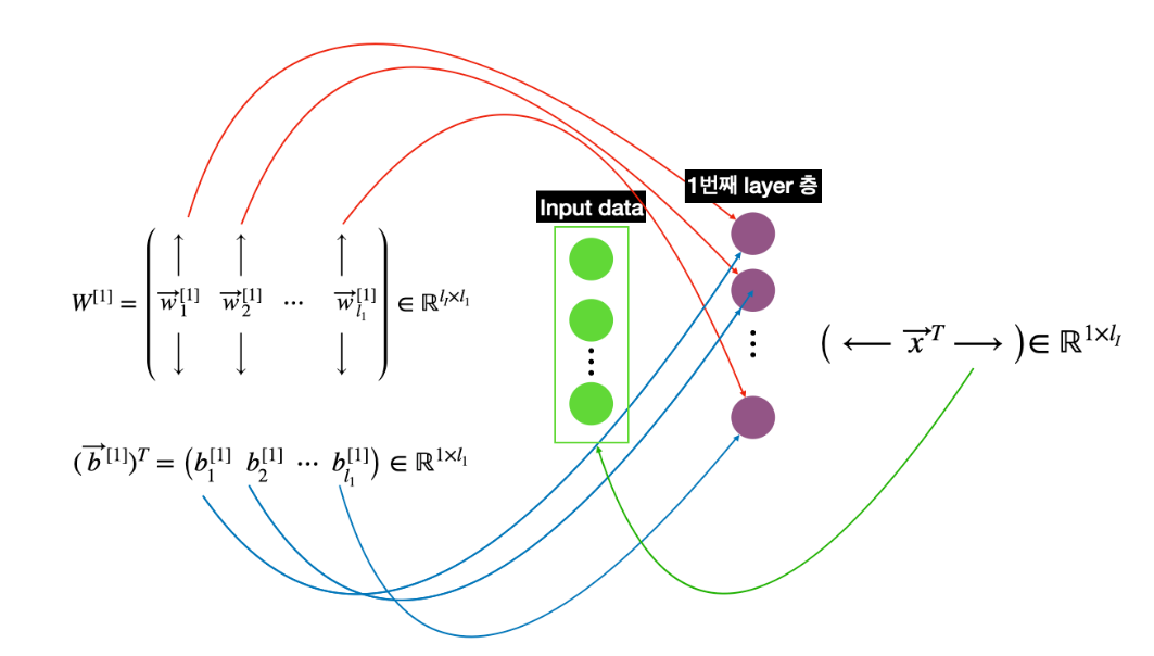 ( 1, $l_1$) → 1은 input 데이터가 몇개 들어왔는지를 의미합니다. 여기선 1개의 데이터 벡터가 들어왔기때문에 1이고, $l_1$은 첫번째 레이어의 뉴런 갯수를 의미합니다.