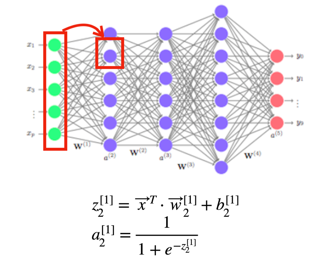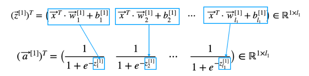 보시다시피 1번째 layer에서 건너온 a는 [1]로 적어주고 반면 2번째 layer에서 새롭게 생긴 weight, bias는 [2]라고 표기해줍니다. 또한 이에 따라 뉴런의 갯수는 $l_2$라고 새롭게 표현해 주겠습니다.