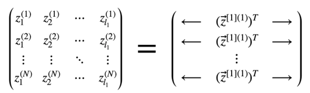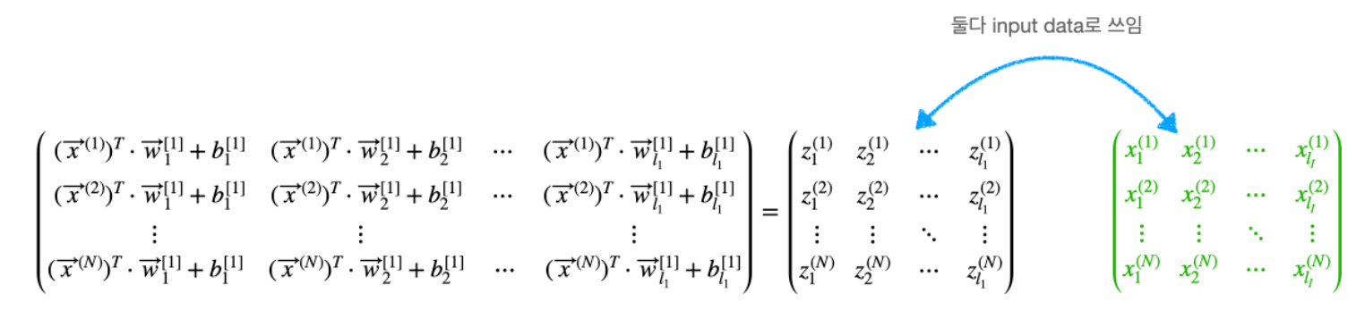 앞서 행렬 연산 특징에서 봤듯이 z데이터(엄밀히 말하면 $\vec{z}^T$)도 각 row방향으로 같은 x데이터가 들어가 있고 단지 거기에 다른 weight, bias가 연산된 것이기 때문입니다.