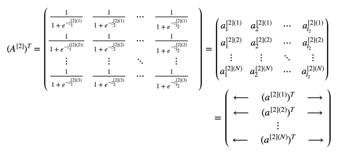 지금까지는 최초 input data인 $X^T$가 뉴런을 통과하는 연산이었다면 이번에는 첫번째 layer를 통과한 $(A^{[1]})^T$가 input으로 사용되어 2번째 layer을 통과할때의 모습을 확인해보도록 하겠습니다.