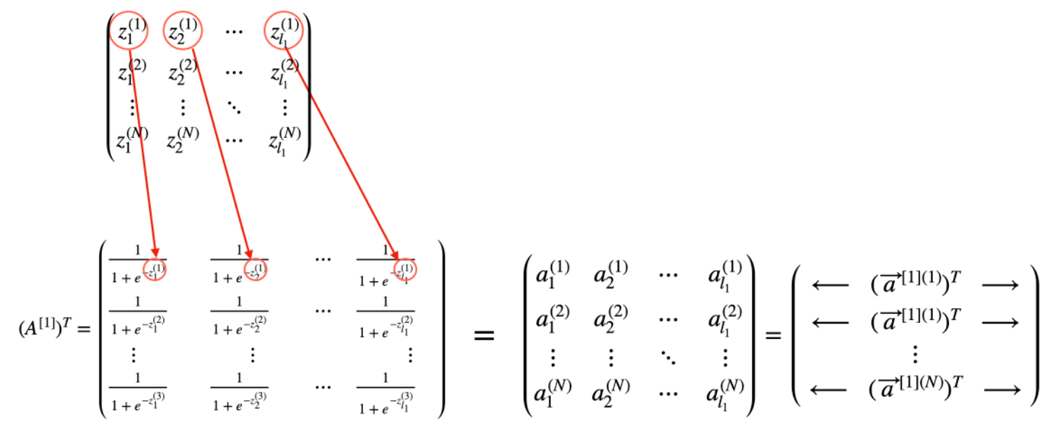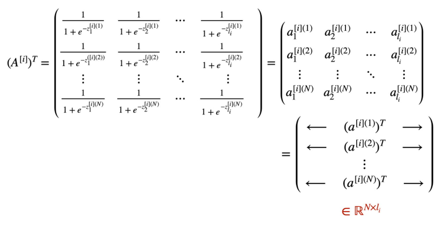 I번째 layer을 통과할것이기 때문에 input 데이터로 들어오는 값은 $(A^{[i-1]})^T$ 로 적어줄 수 있습니다.
