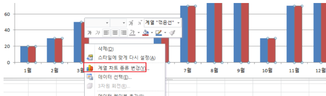여기서 형태를 바꾸고 싶은 그래프를 클릭하여 계열 차트 종류 변경을 눌러줍니다.