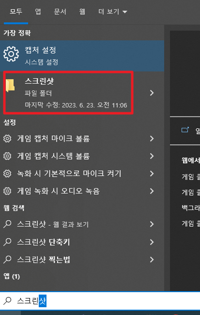 저장된 파일을 확인하고 싶다면 윈도우 검색창에 "스크린샷"을 검색해 폴더에 들어가면 됩니다.