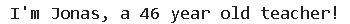 const jonas = "I'm " + firstName + ', a ' + (year - birthYear) + ' year old ' + job + '!';