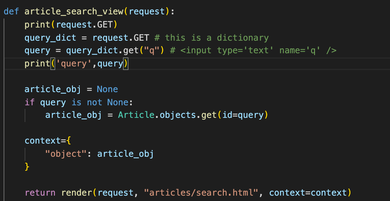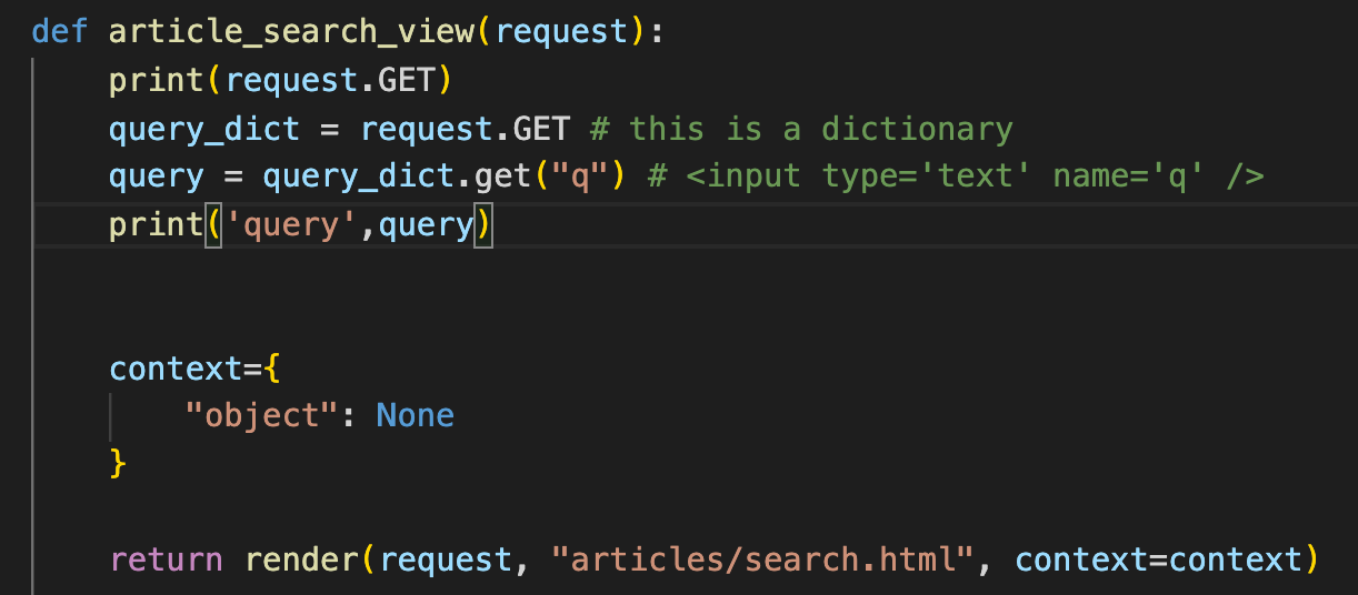 우선 request.GET을 딕셔너리로 선언하고 선언한 딕셔너리에서 get 메소드를 통해 q에 있는 value를 담습니다.