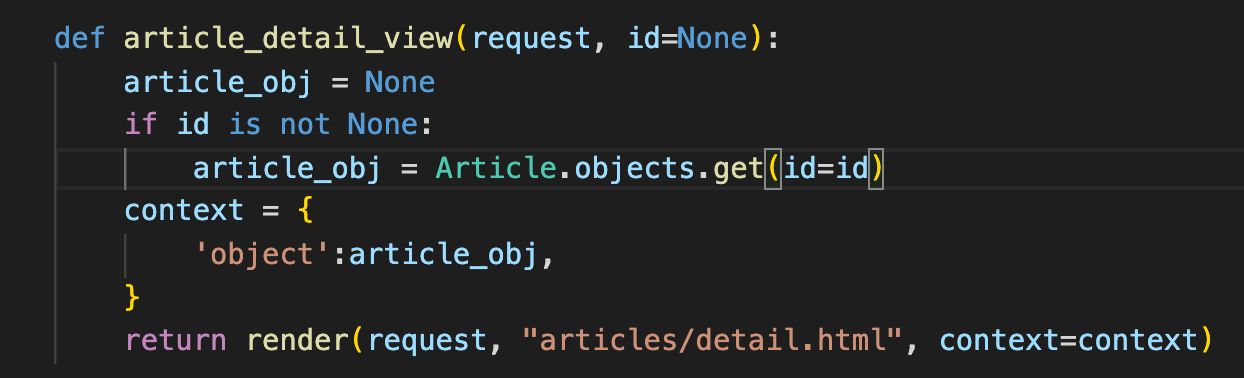 그 후 Article.objects.get(id=id)와 같은 형태로 하나의 article을 뽑고 이것을 html에 뿌려주게 되는것이지요.