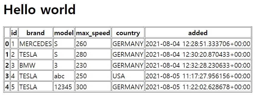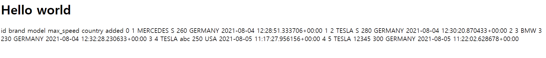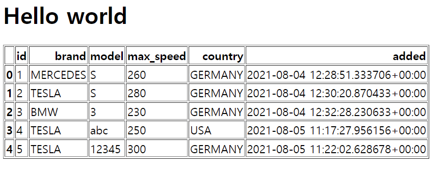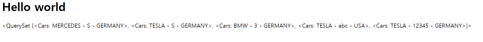 먼저 Cars.objects.all()를 통해 모델의 저장된 모든 instance를 불러오고 해당 값을 context에 넣어 우리 웹페이지에 띄워보겠습니다.