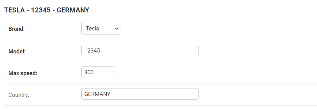 미리 5개의 CARS 인스턴스를 생성하였고, admin에서 확인해보니 아래와 같은 값들이 저장되어 있네요.