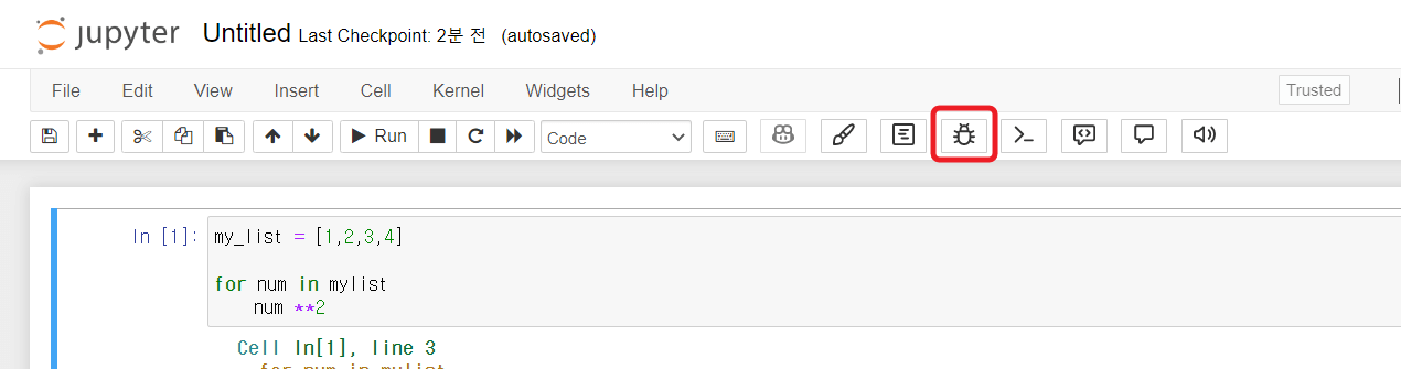 이때 해당 셀을 클릭 후 디버그 모드를 클릭해보자.