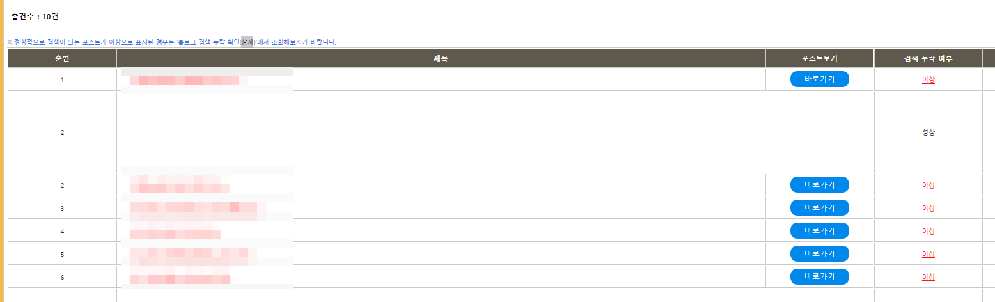 등록되지 않은 포스팅은 등록 누락 여부에 '이상'으로 표시됩니다.