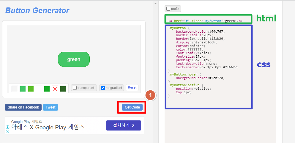 디자인이 완료되었으면 'Get Code' 버튼을 누르면 우측에 css, html 코드를 얻을 수 있습니다.