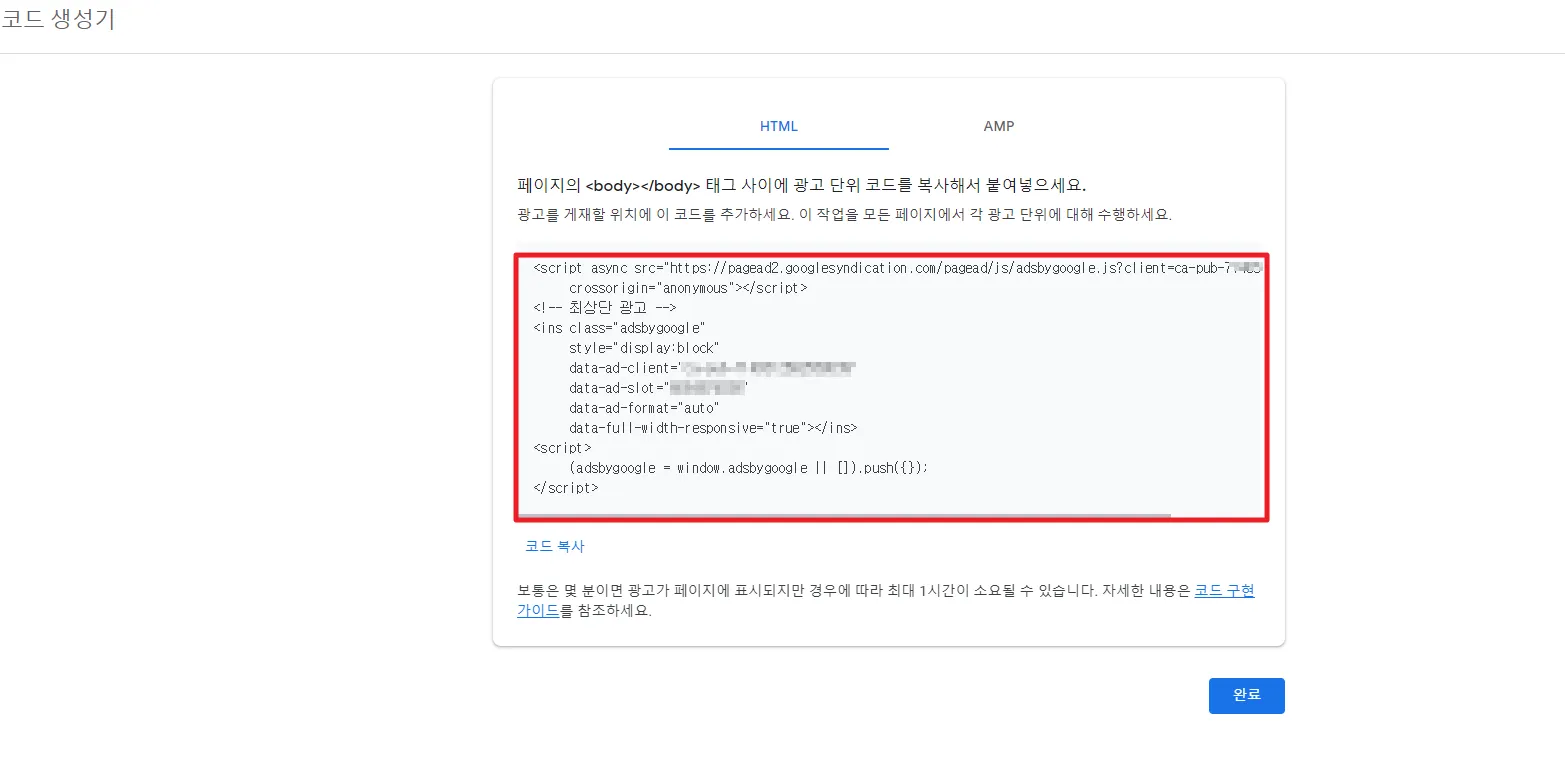 애드센스 홈페이지에서 사용할 광고(디스플레이 광고 단위)를 복사합니다.