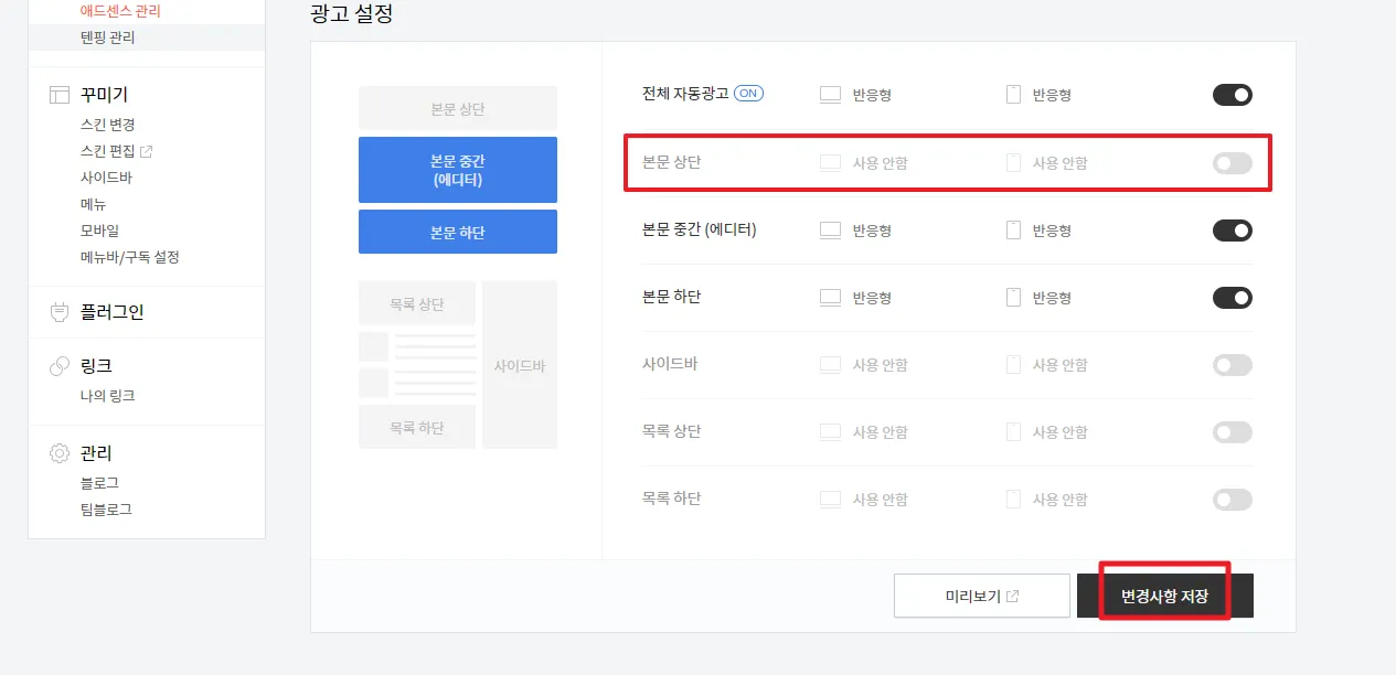 기존에 본문 상단 광고가 설정되어있다면 해제해줍니다.