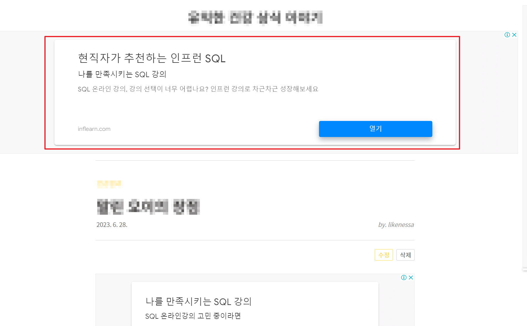 티스토리 자체 광고는 이 부분에서 가장 최상단을 차지하도록 세팅되어 있습니다.