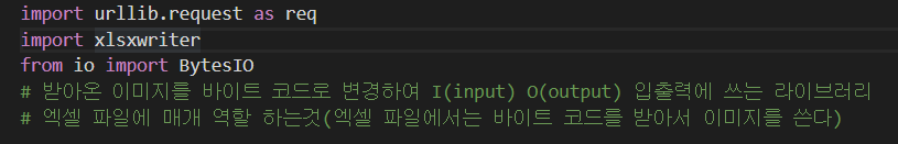 1) from io import BytesIO 엑셀은 이미지를 불러올때 바이트 코드를 받기 때문에 우리가 다운받을 이미지를 바이트 변환할때 사용되는 라이브러리다.