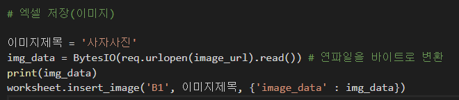 >> worksheet.insert_image('원하는 셀', 이미지제목(화면에 나타나는것은 아니기 때문에 아무거나 적어도 상관없음), {'image_data' : 바이트로 지정한 변수값을 넣어주면됨 })