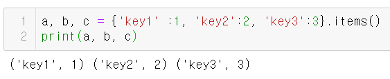 딕셔너리는 unpacking했을때 key값만 나오는 특징이 있습니다.