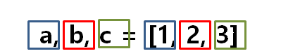 보시는것처럼 오른쪽에 위치한 리스트의 각 원소들이 위치에 상응하는 a, b, c에 들어가는 형태입니다.