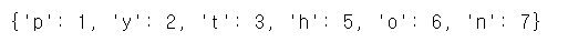 이때 보셔야할 것은 중복되어있던 'h'중 하나가 사라졌습니다. 왜냐하면 딕셔너리에선 key가 하나만 올 수 있기때문이죠.더 구체적으로말하면 순서상 늦게 정의된 'h':5 가 이전 값을 override한것입니다.