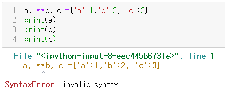 왼쪽 변수부분에는 *를 한번만 사용가능합니다. 두번 사용할시 아래와 같이 syntaxError가 나니 주의하세요!