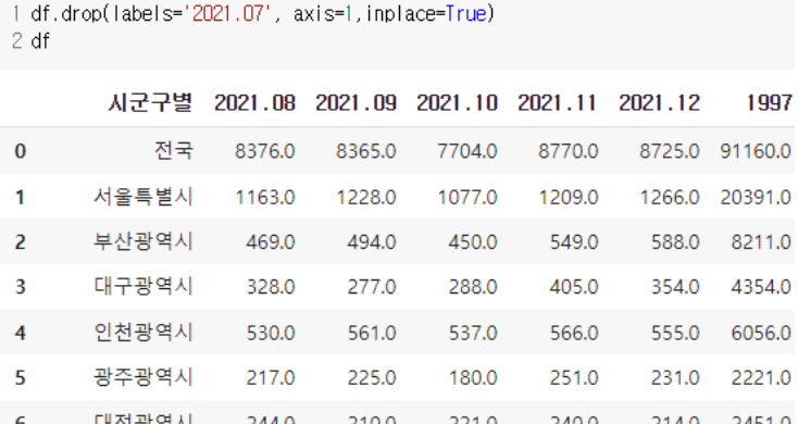 drop 함수 인자인 labels에 삭제하고싶은 컬럼명을 할당해주면 됩니다.