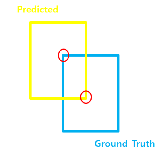 두 바운딩박스의 겹치는 부분, 즉 intersection의 좌상단점과 우하단점을 빨간원으로 표시했습니다.