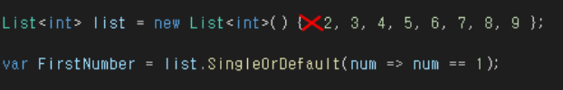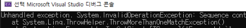 여기서 주의할점은 Single에서 오류가 났던 것은 SingleOrDefault로 해도 여전히 오류가 납니다.