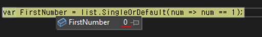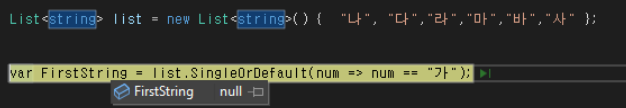 FirstOrDefault는 앞서 설명한 First의 속성을 가지고 있으면서, null을 처리하는 기능을 가지고 있습니다.