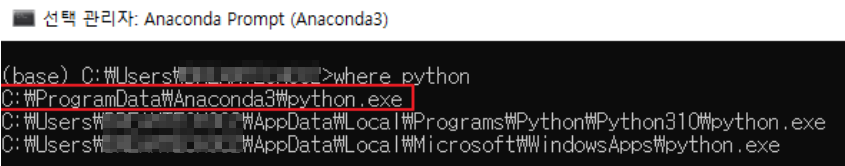 그럼 아래와 같이 python.exe파일이 깔려 있는 경로들이 출력됩니다.