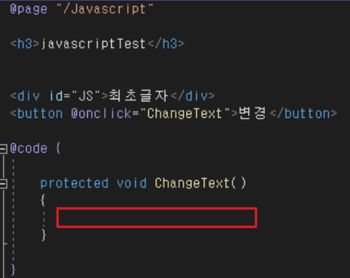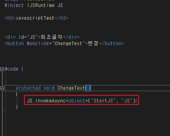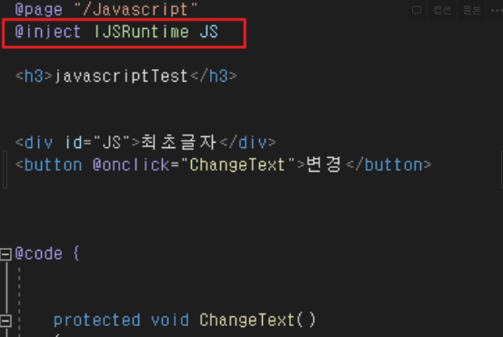 IJSRuntime을 inject시키고 편의상 이름은 JS로 설정하였습니다.