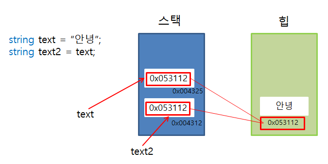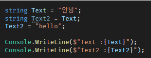 "안녕"이라는 데이터값을 Text라는 변수에 넣고, Text를 다시 Text2에 할당을 한 뒤, 최종적으로 Text2의 값을 변경한 코드입니다.