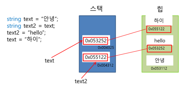string은 참조형식이지만 동시에 immutable type , 즉 불변 객체이기 때문입니다.