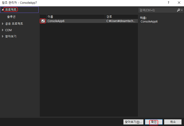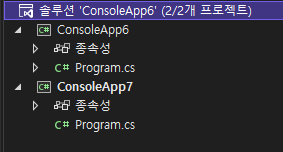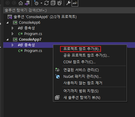여기서 우리가 실행할 프로젝트는 ConsoleApp7 이고, 불러올 클래스가 있는 프로젝트는 ConsoleApp6입니다.