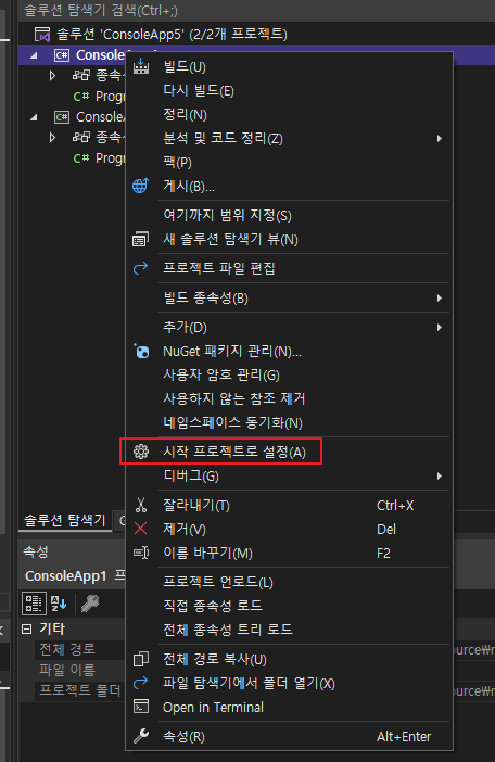 Ctrl+F5 를 통해 파일을 실행시킬때 매번 아래와 같이 실행시키고 싶은 프로젝트에 들어가 시작 프로젝트로 설정을 해줘야 했습니다.