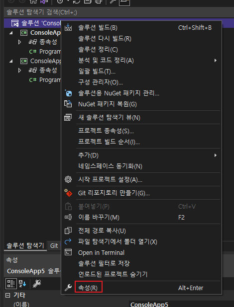 1. 솔루션 마우스 오른쪽 클릭 후 제일 밑에 있는 속성을 클릭합니다.
