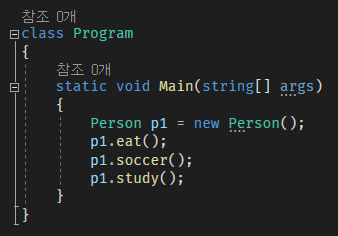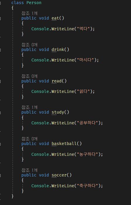 아래 예시처럼 Person 이라는 클래스내에 많은 메소드(함수)들이 있습니다.