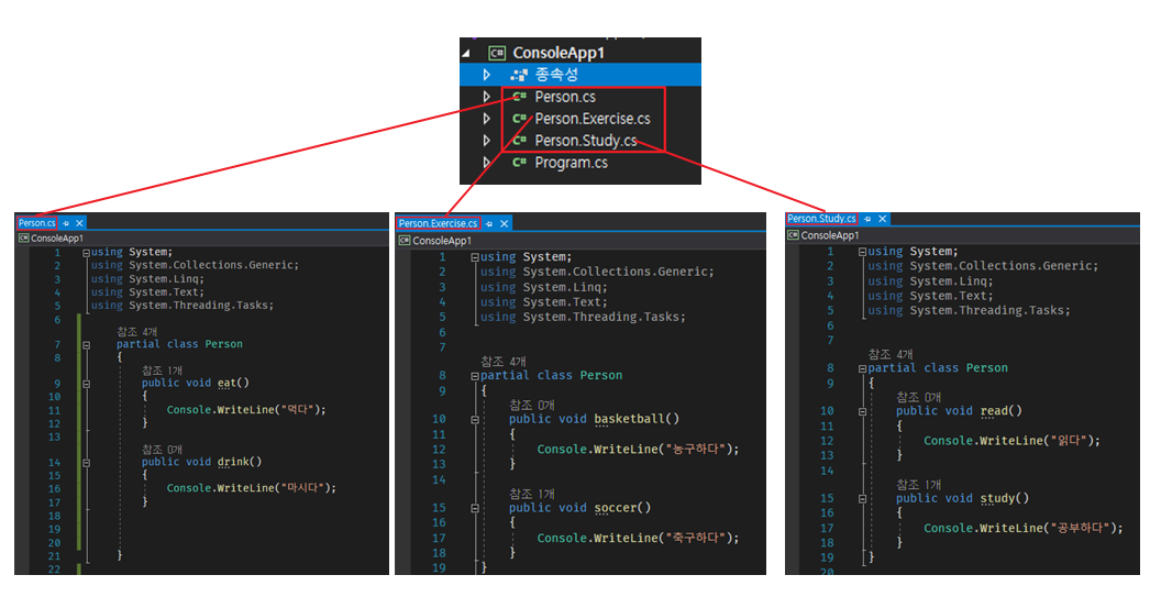 partial 사용법은 같은 클래스명을 사용하되 앞에 partial을 붙혀주면 끝입니다.